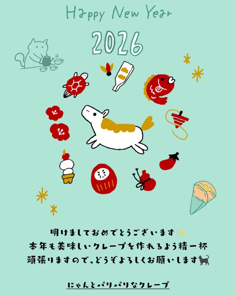 あけましておめでとうございます🎍 2026/01/05 あけましておめでとうございます🎍 今年もにゃんパリをどうぞよろしくお願いします😊✨ 本年は3日から通常営業しております! 2026年も美味しいクレープを皆様に提供できるよう、頑張ります💪🔥🔥 是非、クレープ初めはにゃんパリにご来店ください😸