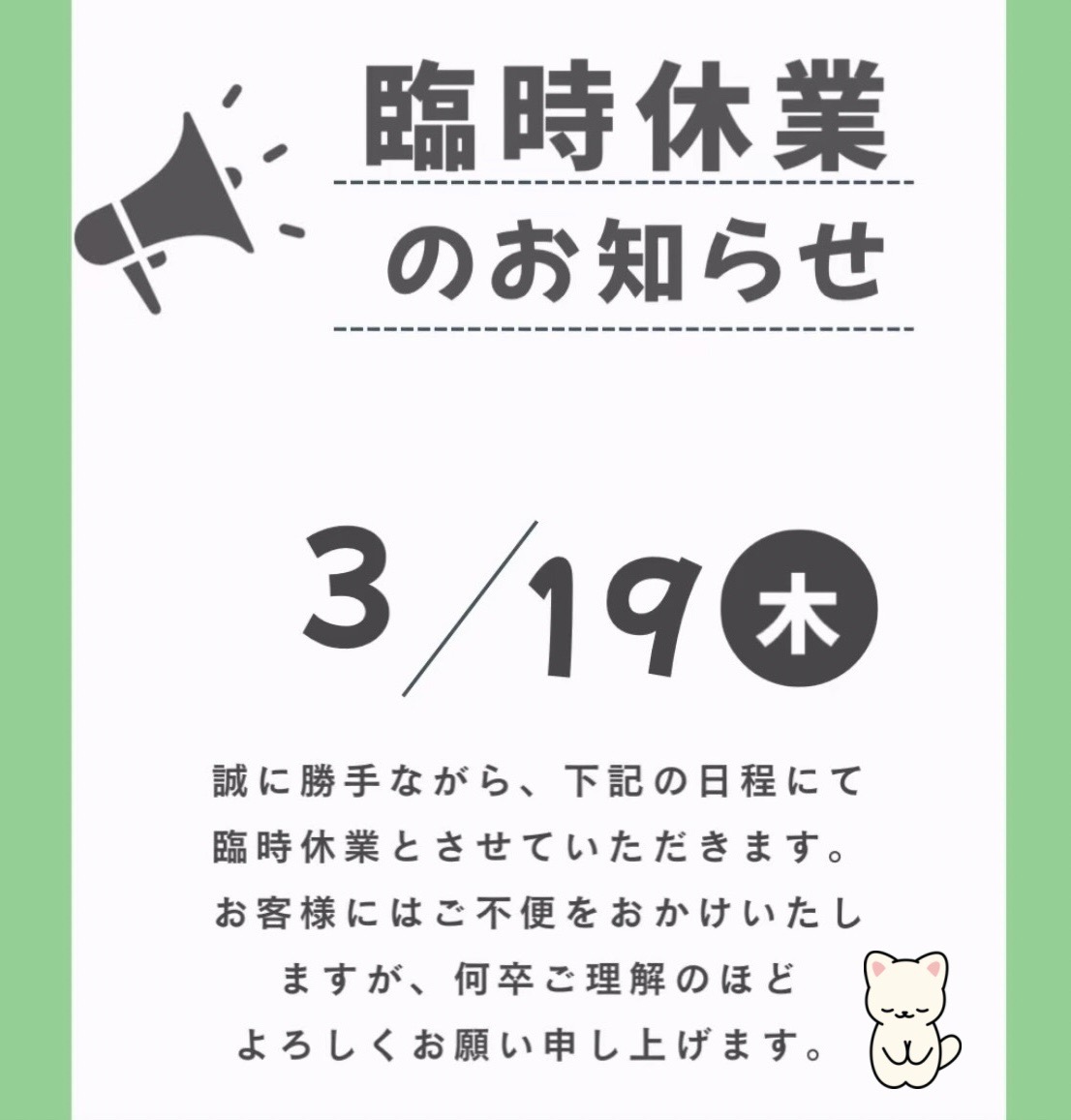 📢臨時休業のお知らせ📢 2026/03/18 誠に勝手ながら、店舗都合により3/19(木)を臨時休業とさせて頂きます。 本日の定休日と合わせて2日間の店休と致します。ご迷惑おかけして申し訳ございませんがよろしくお願い致します(>人<;) 次回営業日は3/20となります! 沢山のご来店、心よりお待ちしております🥰
