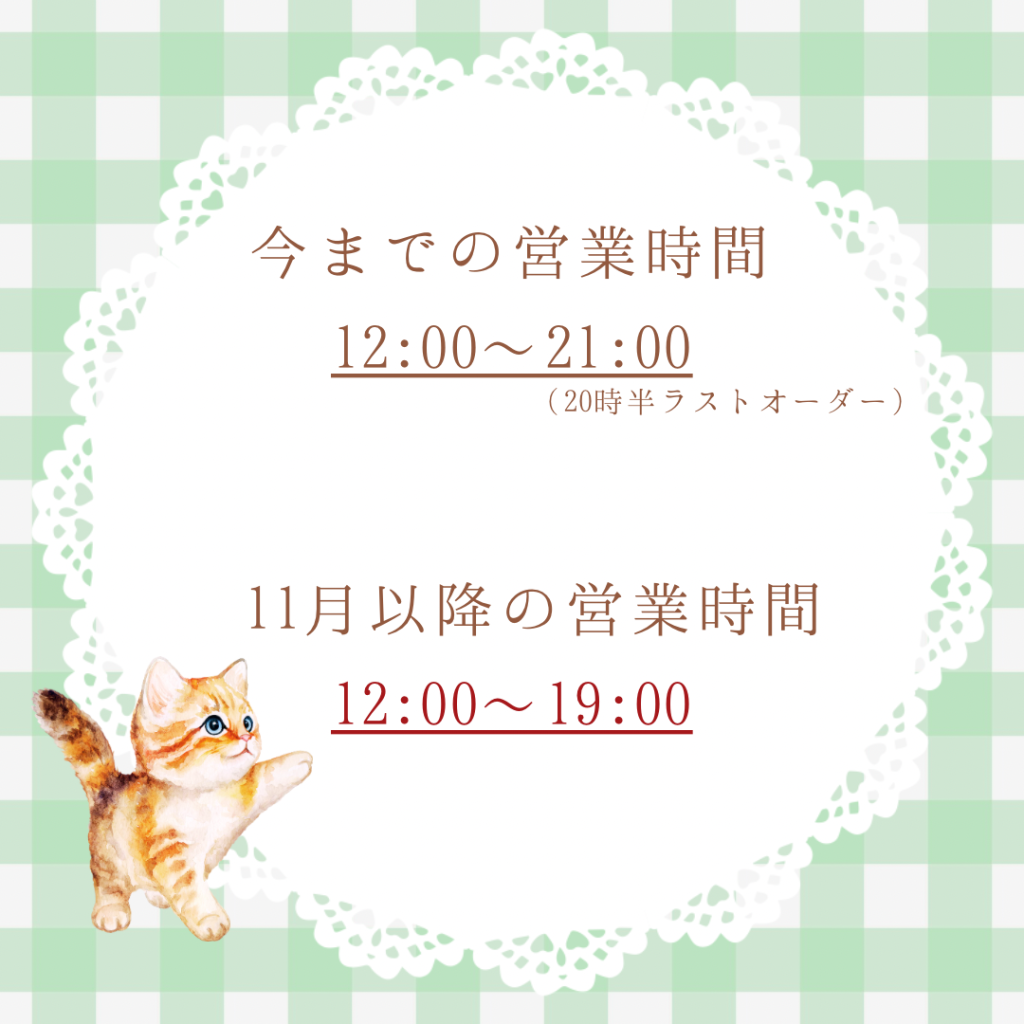 11月から営業時間を変更します! 2025/09/21 こんにちは! にゃんとパリパリなクレープです🐈 皆様に大切なお知らせがあります‼️ 11月から当店の営業時間を短縮致します🍀 現在20時半ラストオーダー、21時閉店ですが、11月1日から19時ラストオーダー、19時閉店に変更になります! ご迷惑をおかけいたしますが、ご周知の程、よろしくお願い致します🙇♀️ 今後も美味しいクレープを届けられるようにスタッフ一同頑張ります😸💕 皆様のご来店、お待ちしております⭐︎