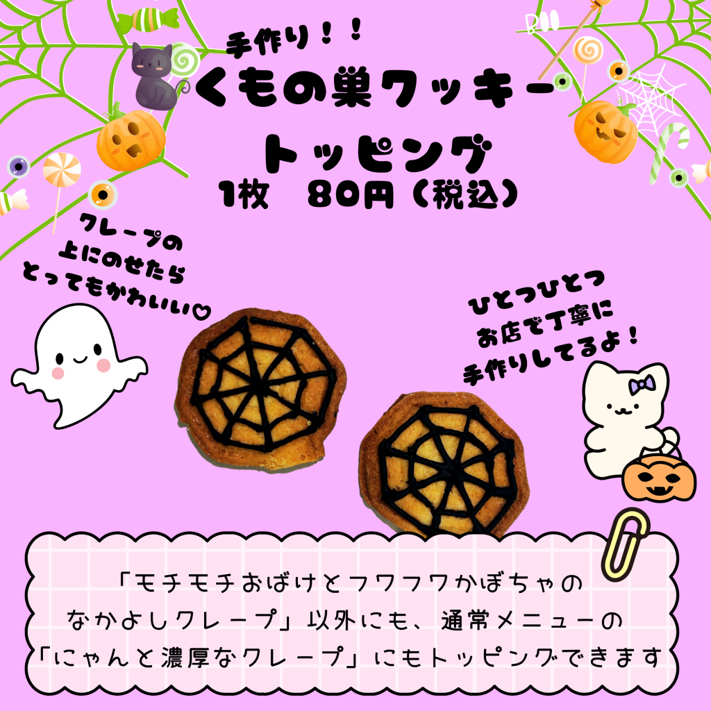 ハロウィン期間中の間、手作り蜘蛛の巣クッキーが「にゃんと濃厚なクレープ」の上に➕80円(税込)でトッピングできます🍪